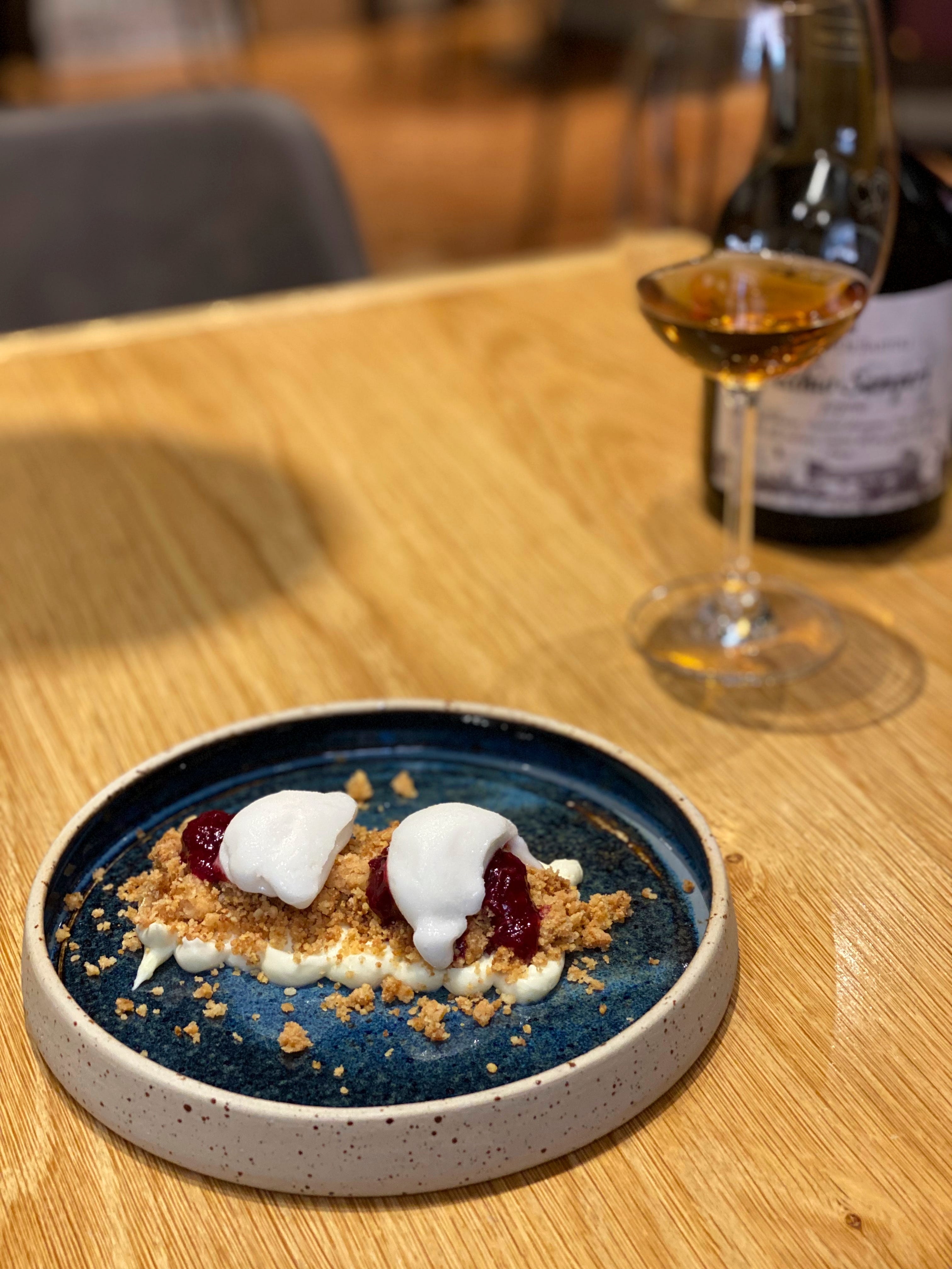 A base of cream of mascarpone, covered in almond crumble and topped with raspberry reduction and lemon sorbet. Despite the multitude of flavours, there was no competition for the tastebuds. Everything on the plate came together in a refreshing and fruity balance.