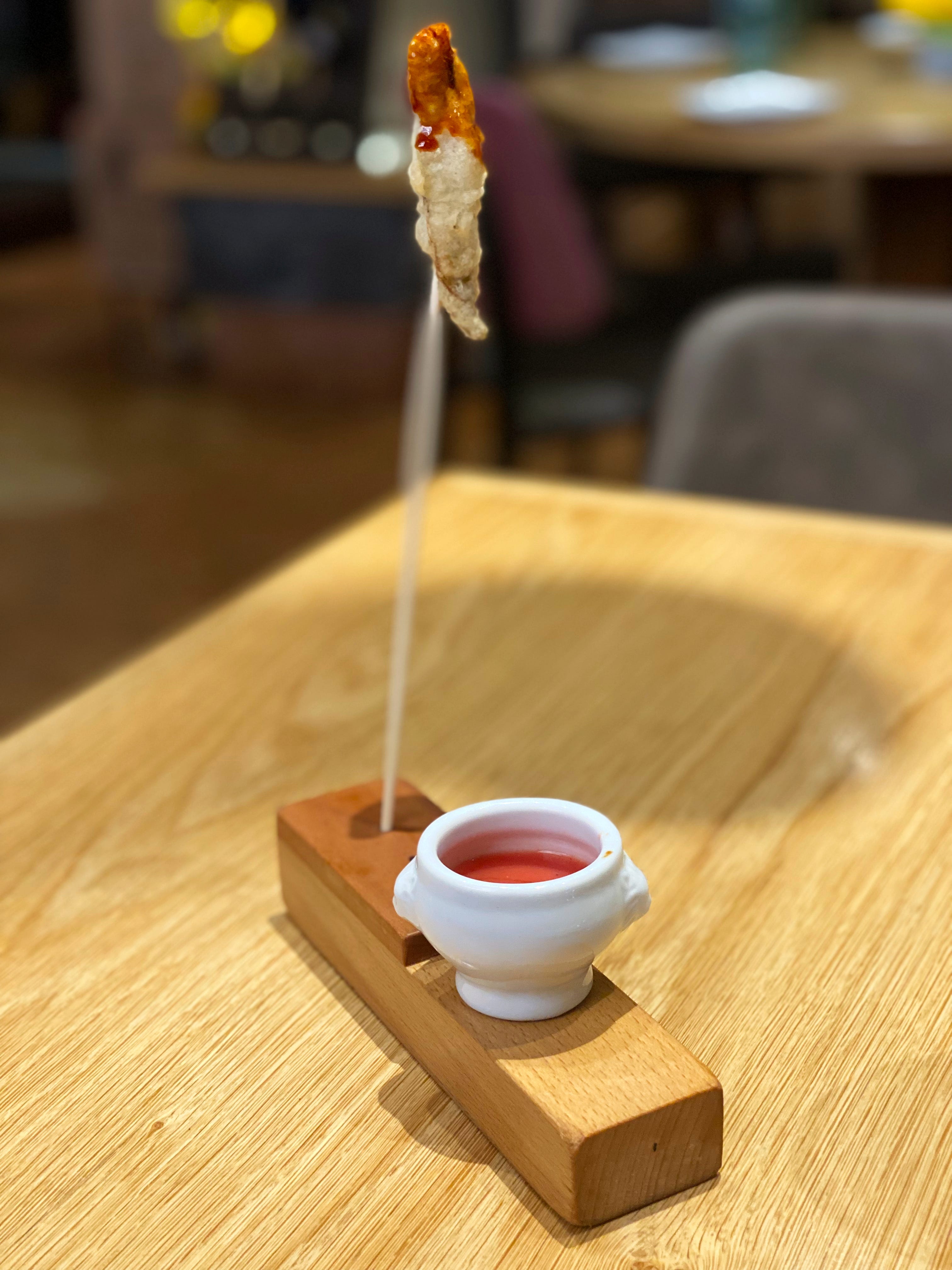 A tempura sardine, dipped ever so lightly in a teriyaki sauce and served on a skewer. Alongside, a gaspacho of tomato and watermelon with balsamic vinegar.