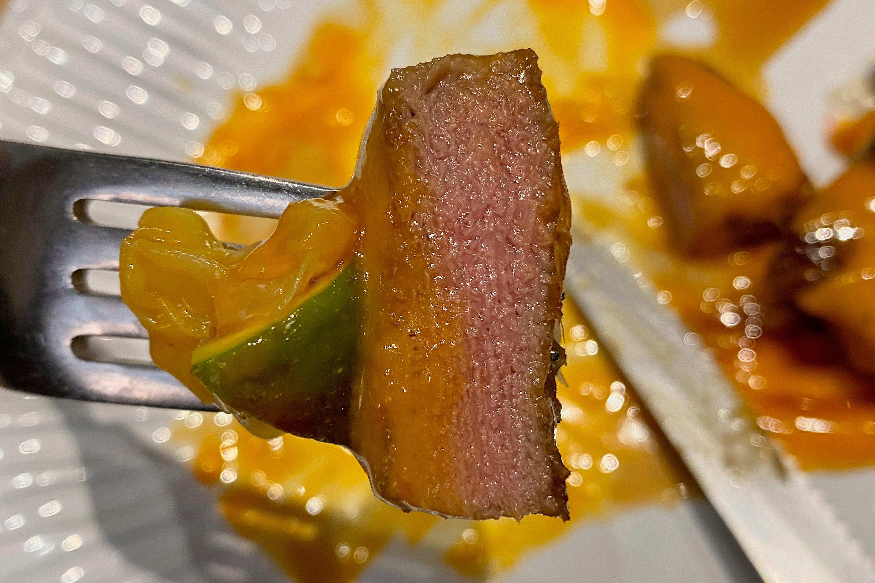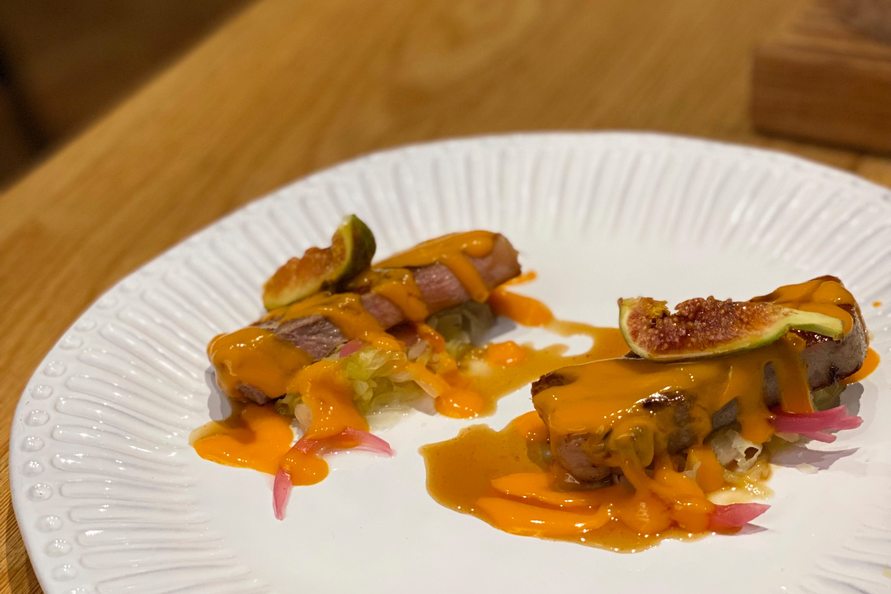It’s starters up next, and I’ve chosen the carnivore option: veal tongue with caramelised Tropea onions, fig, and an apricot sauce.