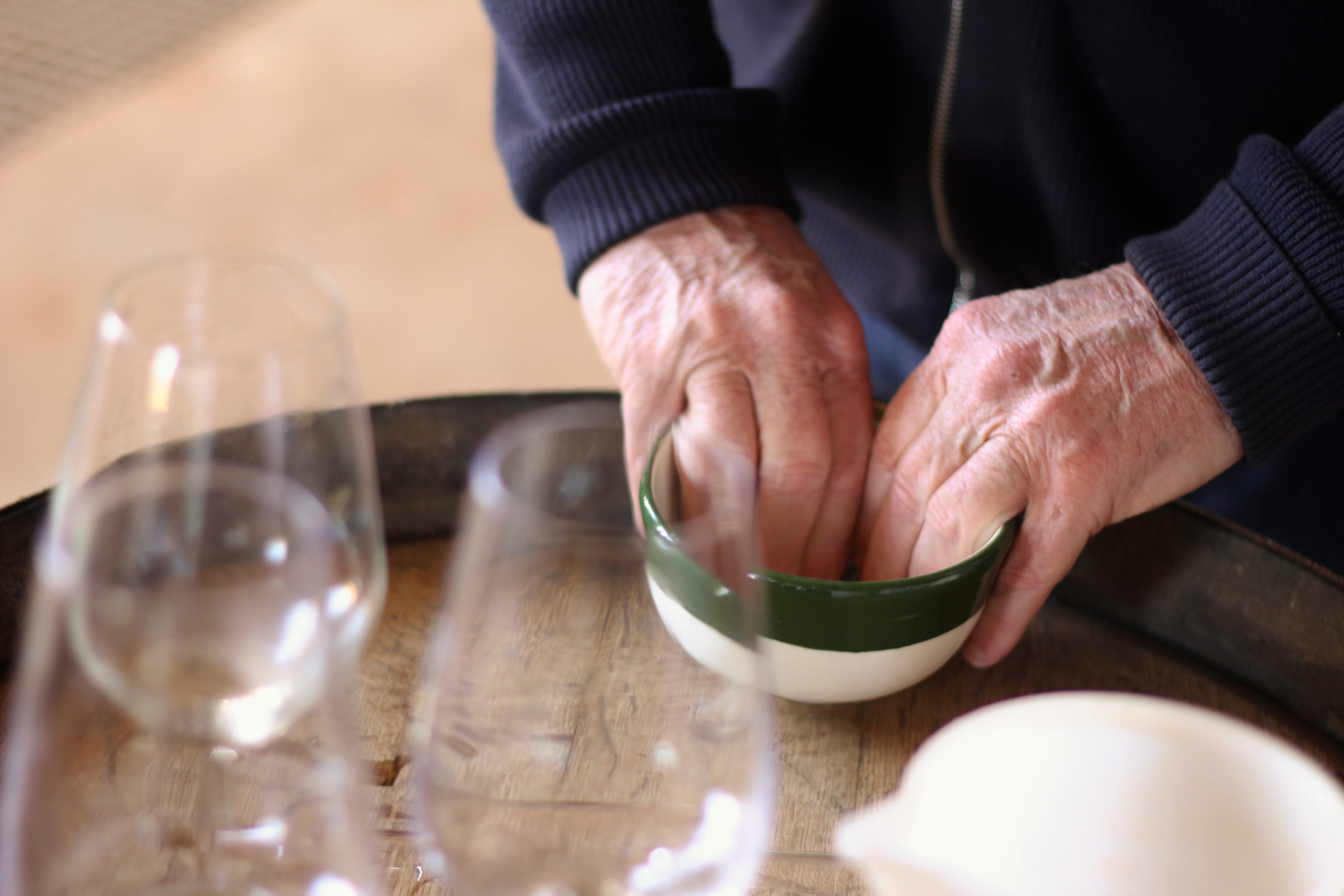 He leads me to the rammed earth house, where the remainder of the tasting group stands. His daughter, Kiki, shows me inside to put down my bag and grab a glass. And then we’re off to the cellar.